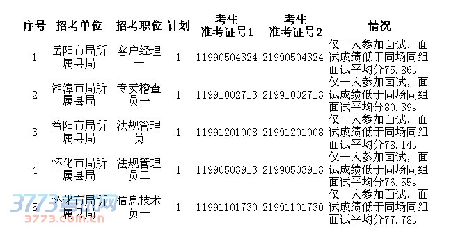 1、按照2014年湖南省烟草专卖局系统公开考试聘用工作人员每个职位笔试、面试加权综合成绩从高到低的顺序,确定入围体检环节人员名单。其中,以下5个职位因参加面试考生人数未形成有效竞争,且参加面试考生面试成绩低于同场同组所有考生面试成绩平均分,根据招聘公告规定,不予通过。