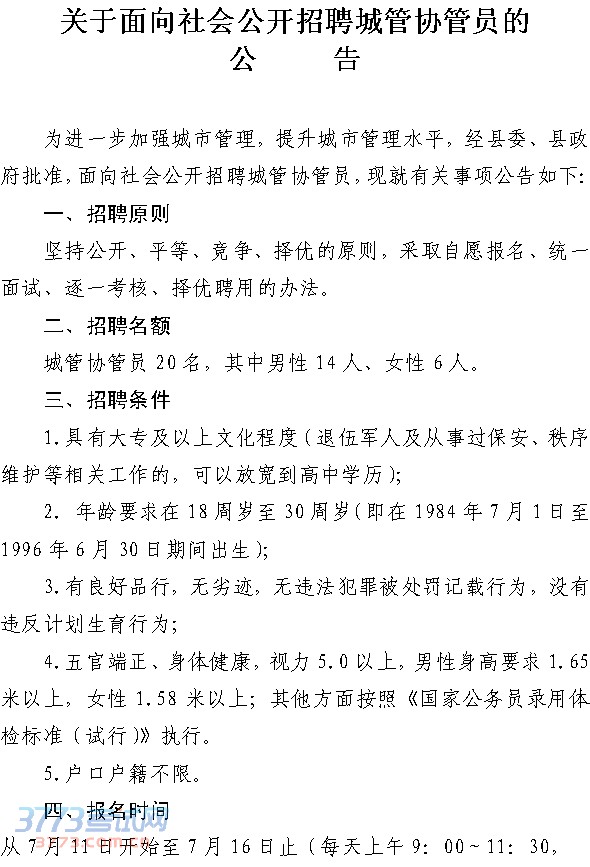 2014年湖南郴州市汝城县社会招聘城管协管员公告