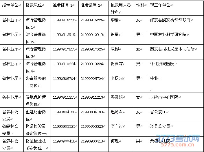 根据《湖南省2015年度考试录用公务员工作实施方案》,经报名、笔试、资格审查、面试、体检、考察等程序,省林业厅拟录用2015年度公务员及参照公务员法管理事业单位工作人员李静、贺勇、成彬、贺禹霖、李杨阳、廖凌娟、赵聆君、李向波、何理、李卓、胡振华、纪程灵、吴欢、伍翔宇、杜佳、黄雨珣、毛丹,现公示如下: