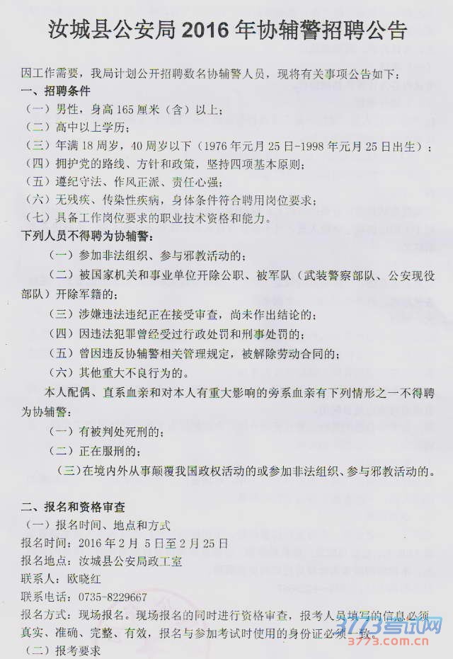 湖南郴州市汝城县公安局2016年协辅警招聘公告