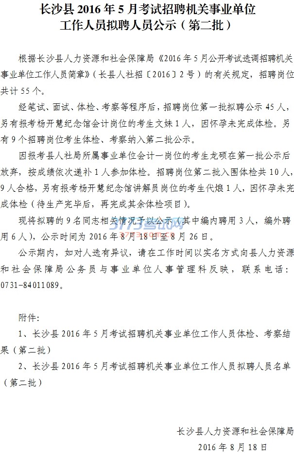湖南长沙县机关事业单位2016拟聘公示(第二批)