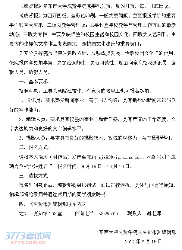 东南大学成贤学院《成贤报》编辑部2014年招聘启事
