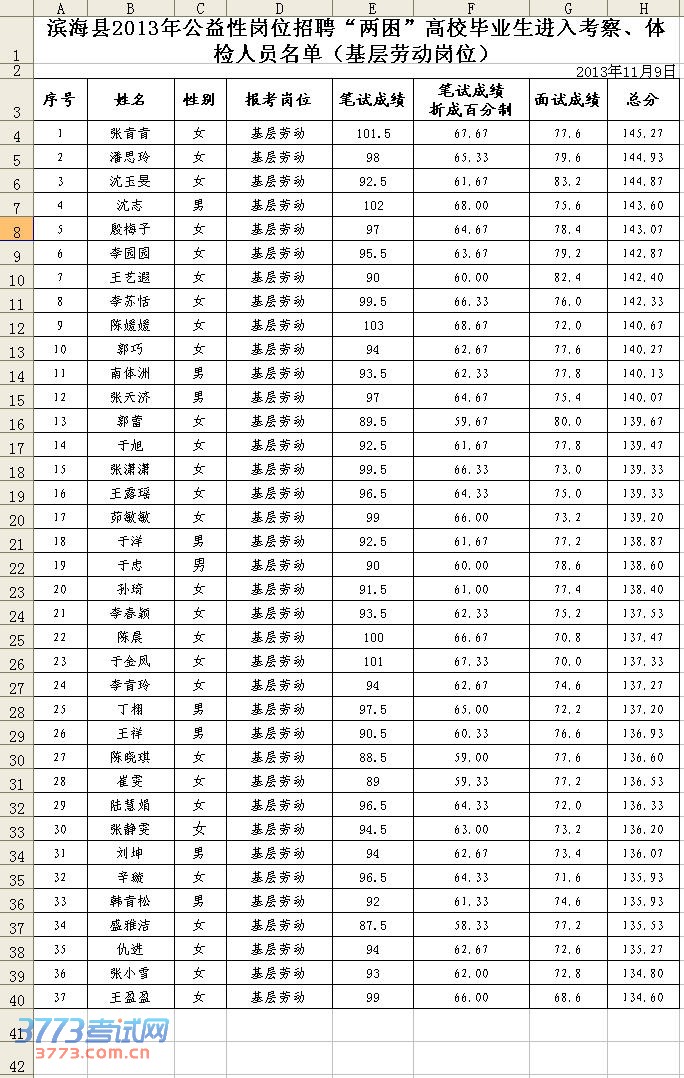 江苏滨海县2013年基层公益性岗位招聘体检名单