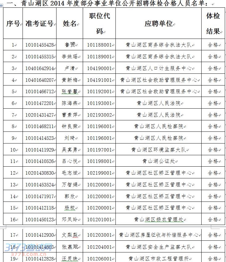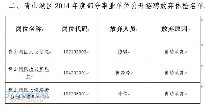 根据《南昌市2014年度部分事业单位公开招聘公告》工作安排,2014年南昌市部分事业单位公开招聘工作笔试、面试、体检工作已结束,现将报考青山湖区部分事业单位体检合格人员名单及放弃入闱体检资格考生名单公告如下,本次事业单位公开招聘按公告要求将不对放弃体检资格人员进行替补,下一步政审工作将由各用人单位与考生具体联系开展: