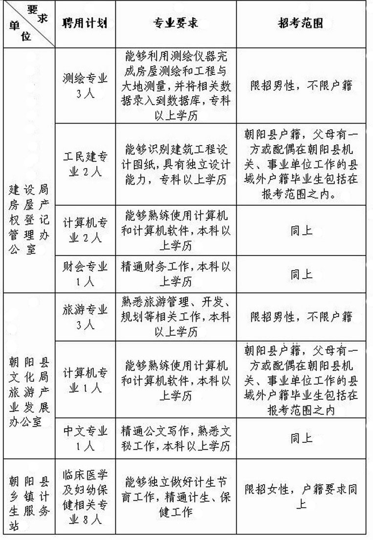为全面做好我县待业人员就业安置工作,根据我县事业单位用人需求,经县编委会研究决定,朝阳县建设局房屋产权登记管理办公室(自收自支事业编制)、朝阳县文化局旅游产业发展办公室和朝阳县部分乡镇计生服务站(全额拨款事业编制)招聘工作人员和专业技术人员,为保证招聘工作顺利实施,现将有关事项公告如下: 一.聘用原则 1.坚持公开、公平、竞争、择优的原则; 2.坚持考试聘用原则。 二.报考对象及范围 1.朝阳县建设局房屋产权登记管理办公室和文化局旅游产业发展办公室的报考人员应是全国普通高等院校国家计划内统一招收的大专以上学历的应往届毕业生; 2. 朝阳县乡镇计生服务站的报考人员应是全国普通中等专业以上学历国家计划内统一招收的、具有助理执业医师资格证及以上资质的应往届毕业生; 3. 聘用计划、专业及范围: