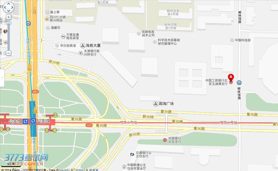 图中A处为中国科学技术信息研究所(海淀区复兴路15号),位于中央电视台(旧址)西门对面。