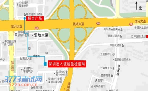说明:可乘坐公交至联合广场站下,步行约750米(蓝色曲线为步行方向,如在滨河大道北侧下车需通过人行天桥到滨河大道南侧)即可到达深圳出入境检验检疫局。26,28,52,73,109,229,235,338,367,382,J1,K548,K568,高峰专线21,机场9线均可到达联合广场站点。