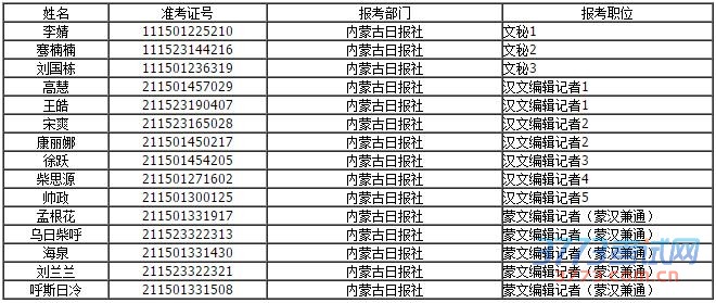 2015内蒙古直属(含部门所属)事业单位党群系统拟聘公示(十)根据《内蒙古自治区党政群直属事业单位2015年度公开招聘工作人员简章》,经过笔试、面试、体检、考察等环节,现对2015自治区党群系统部分事业单位公开招聘拟聘用人员予以公示。