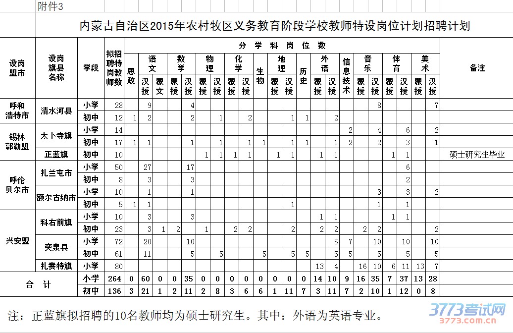 3.内蒙古自治区2015年农村牧区义务教育阶段学校教师特设岗位计划招聘计划