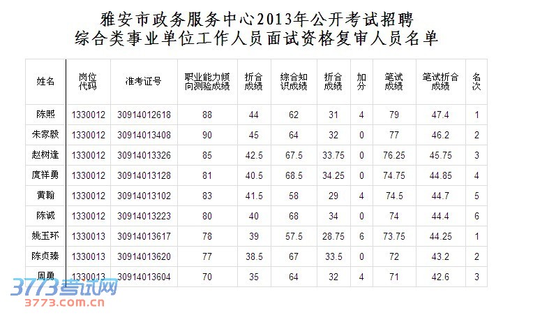雅安市政务服务中心2013年公招综合类事业面试资格复审的公告