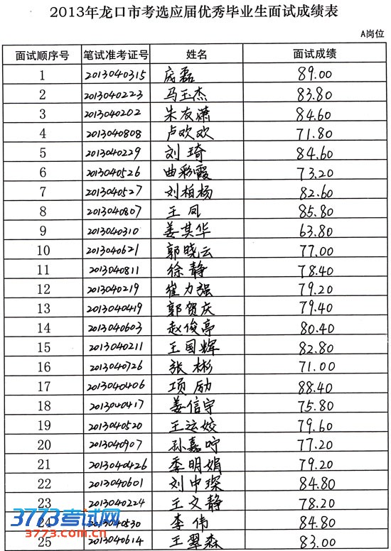 山东2013年龙口市考选应届优秀毕业生面试成绩