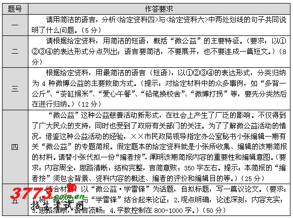 第五题:本题是一道议论文写作题,要求以“微公益•学雷锋”为话题。考生在写作中需要注意两点:第一,文章中必须对“微公益”与“学雷锋”的关系进行阐释、分析。第二,在提出对策或具体分析中,不能只根据二者之一展开论述,必须将两者结合起来论证。