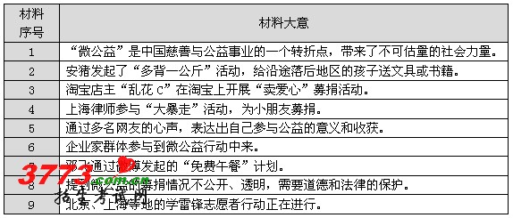 第三题:本题是一道创新性的归纳概括题,需要考生根据给定资料中出现的事例,按照4种救助方式,对事例的内容先进行简要概括,而后分类归纳。