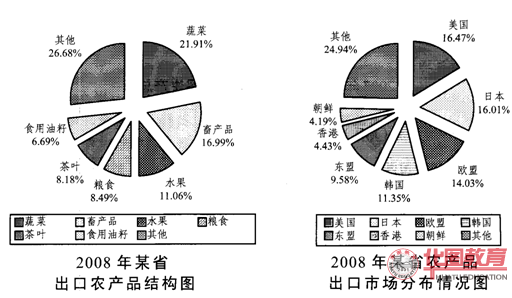 96. 2008年,某省农产品进出口贸易总额为7.15亿美元,比上年增长25.2%。其中,出口额为5.02亿美元,增长22.1%;进口额为2.13亿美元,增长33.2%。农产品进出口贸易额占全省对外贸易总额的4.5%。出口额居前5位的产品为蔬菜、畜产品、水果、粮食和茶叶,而绿茶出口额占茶叶出口额的四分之三。全省农产品对东欧、非洲、拉美等国家和地区的市场进一步开拓,出口额比上一年进一步增长。其中,对美国的出口额增长16.0%;对日本的出口额增长7.3%;对韩国的出口额增长59.8%;对东盟的出口额增长58.6%。