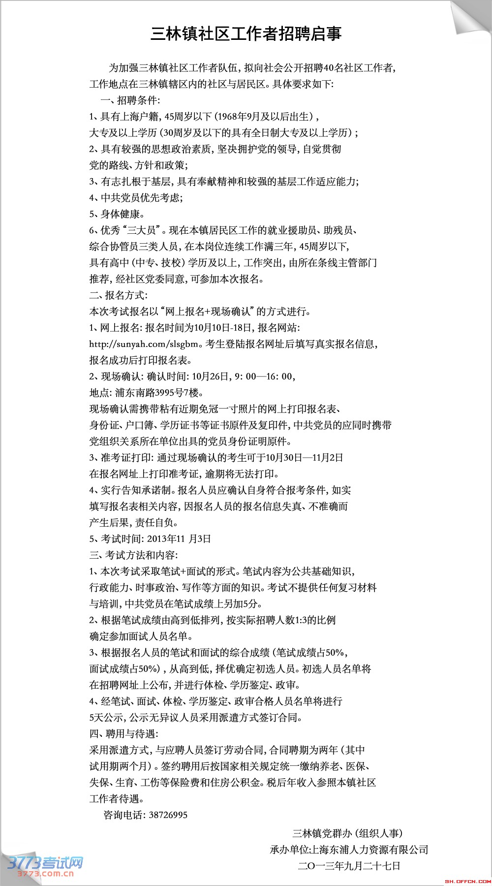 上海2013年三林镇社区工作者招聘40人公告