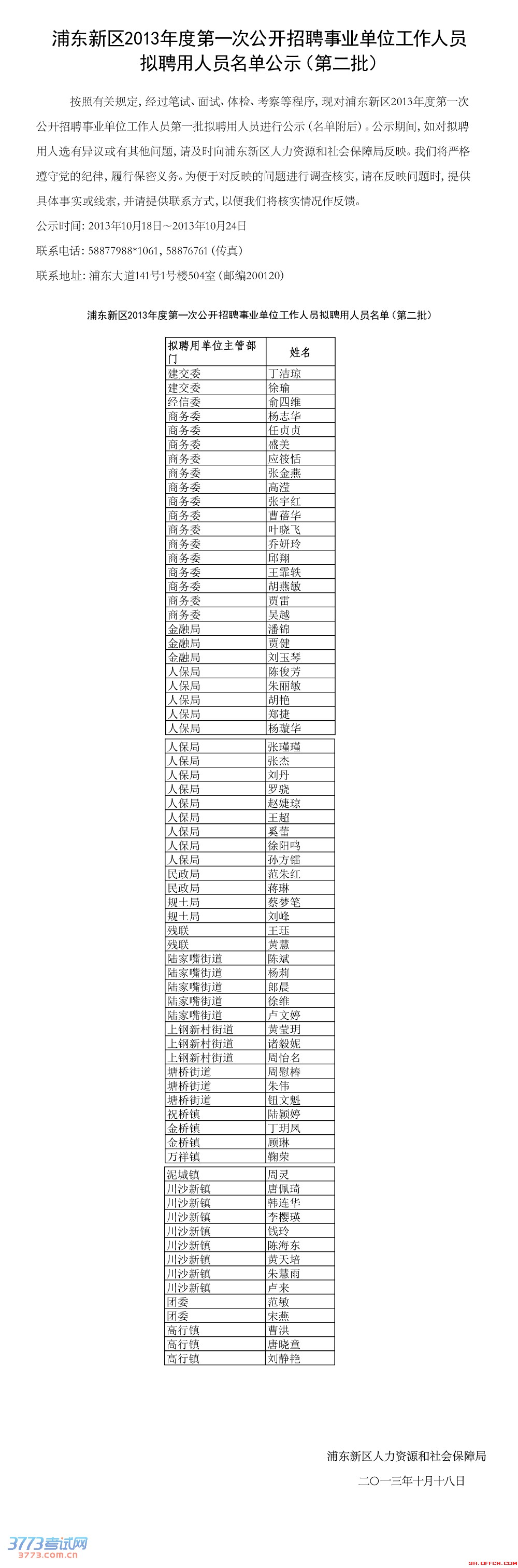 上海浦东新区上半年2013年事业单位拟聘用名单公示(第二批)
