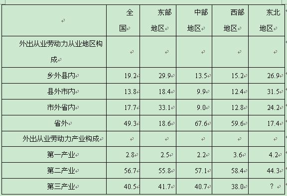 2006年全国农村外出从业劳动力流向及从业情况统计表(单位:%)