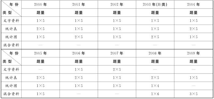 资料分析部分,主要通过文字资料、统计表和统计图的形式命题,每1类资料一般都对应5道题目。