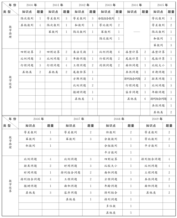 据上表可知,数量关系部分有数字推理和数学运算两大类题型。在数字推理中,以等差、等比数列及两者的混合为考查的重点,同时也会出现平方数列、隔次数列等形式的命题;数学运算题涉及的应用题型种类繁多,其中工程问题、排列组合问题、路程问题等类型出现频率较高,应试者复习时应注意对这些题