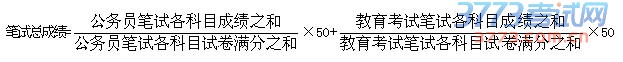考生的笔试总成绩由公共科目笔试成绩与教育入学考试成绩合成,其计算公式为: