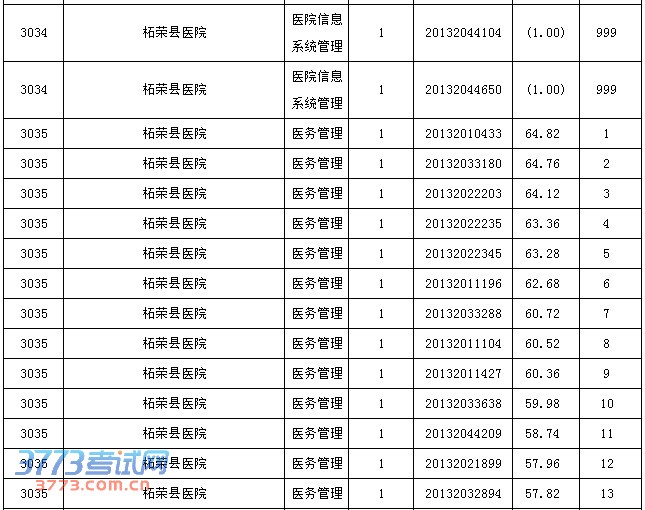 福建2013年下半年柘荣县事业单位招聘笔试成绩公示