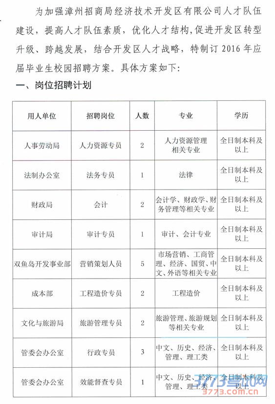 2016福建漳州招商局经济技术开发区校园招聘公告