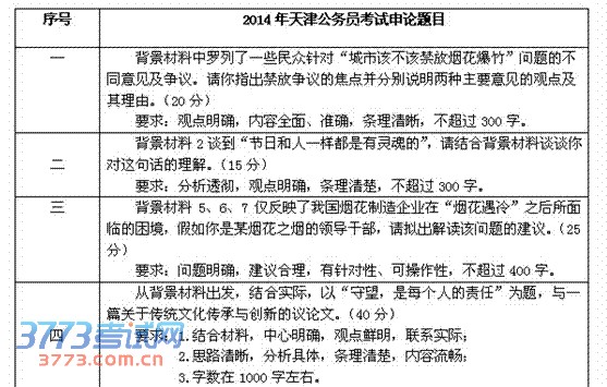 第一题,归纳概括。2014年天津市公务员考试申论第一题,是典型的“热身”题型。要求考生指出禁放争议的焦点并分别说明两种主要意见的观点及其理由,作答字数限300字以内。因此,解答本题的关键在于,考生需要仔细审题,明确题目到底有几个子问题,分别罗列争议的焦点、两种主要意见的观点及理由。唯此,方能不漏题,保得分。
