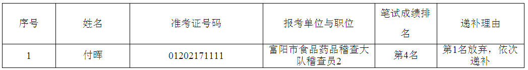2014年浙江杭州市富阳市考试录用公务员面试对象递补名单