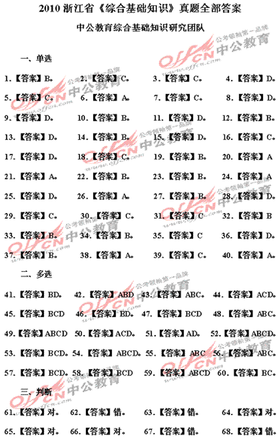 2010年浙江公务员考试综合基础知识真题答案