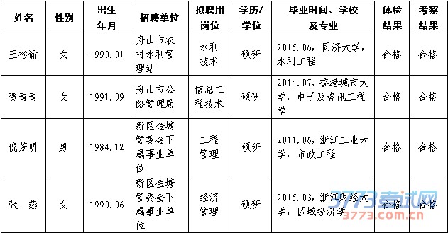 根据《浙江省事业单位公开招聘人员暂行办法》及《2014年下半年浙江舟山群岛新区人才储备中心公开招聘高层次人才公告》(2014年第30号)规定,经过考试、体检、考察等程序,拟聘用王彬谕等4人为试用考核人员。公示时间:2015年3月5日—3月13日(7个工作日)。