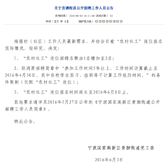 浙江宁波贵驷街道2016招聘名额增加及报名时间延长公告