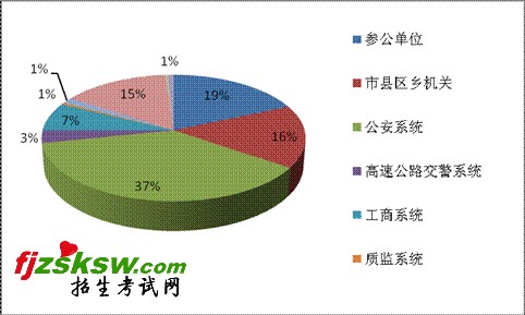 可见公安系统的招考人数是最多的,有1009人;参公单位次之,招录501人,招录人数较多的还有市县区乡机关,共434人。此外,高速公路交警系统87人,工商系统196人,质监系统13人,劳教系统40人,监狱系统400人,国家统计局福建调查总队(参公)6人,省级机关23人。