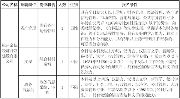 杭州余杭经济开发建设有限公司是余杭经济技术开发区管委会直属国有公司,因公司发展需要,面向社会公开招聘工作人员3名,现就有关事项公告如下:
