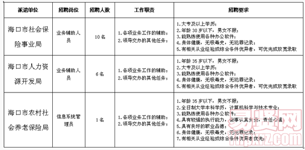 因业务工作剧增,海南众合人力资源开发有限公司现面向社会,招聘共计17名劳务派遣员工,外派至海口市人力资源和社会保障局局属事业单位工作。本次所招聘的均为劳务派遣员工,由海南众合人力资源开发有限公司与员工签订劳动合同。