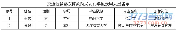 按照事业单位公开招聘有关规定和我局招聘公告中确定的工作流程,经过前期简历初选、资格审查、面试、体检、考察等环节和程序,经研究,确定拟录用王鑫、张毅2名同志到我局相应岗位工作,现将招聘结果予以公示。公示期间,如有问题,请向交通运输部东海救助局人事教育处反映。