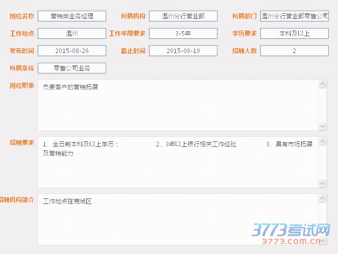 宁波银行温州分行瓯海支行2015年招聘营销类