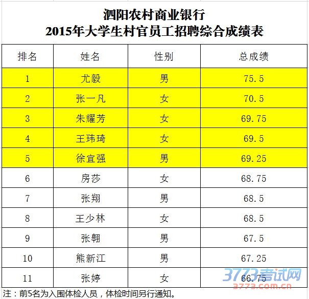 2015年江苏泗阳农村商业银行大学生村官员工招聘综合成绩表公示