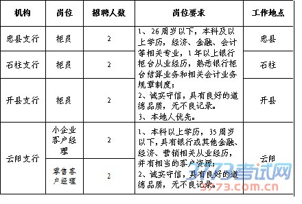 重庆三峡银行股份有限公司是经中国银监会批准,设立在重庆直辖市的股份制商业银行。成立以来,各项业务迅速发展,经营稳健。截止2015年6月末,在全市拥有营业网点73个,全行资产总额1160亿元,各项存款余额783亿元,各项贷款余额306亿元,上半年完成利润11亿元。因发展需要,现公开招聘柜员、客户经理数名,我们诚邀有志有识之士,共创辉煌的明天!