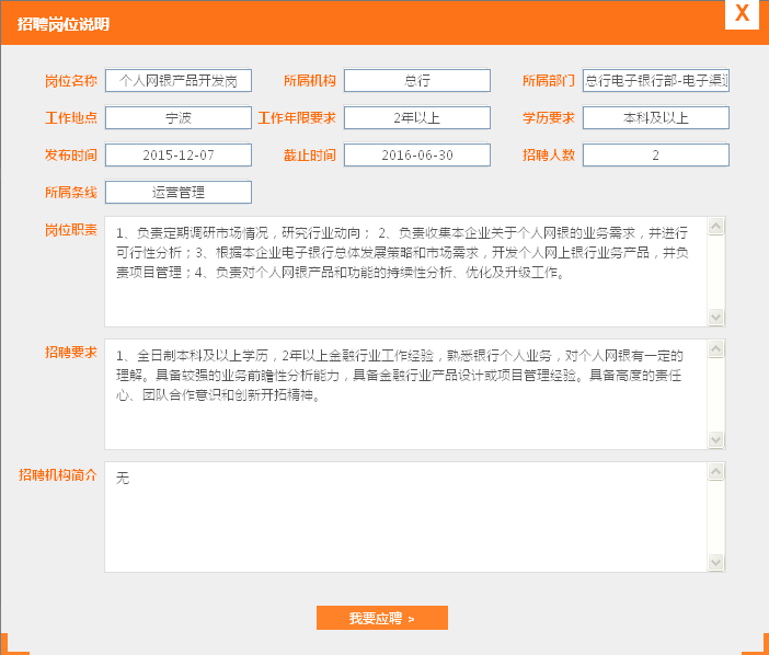 宁波银行总行电子银行部2016年招聘个人网银产品开发岗启事