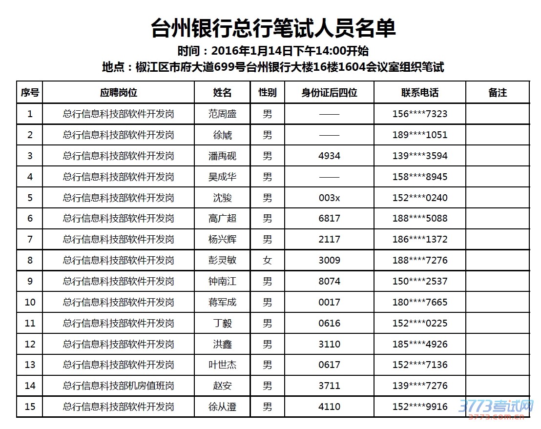 定于2016年1月14日(周四)下午14:00起,在椒江区市府大道699号台州银行大楼16楼1604会议室组织总行对外招聘岗位应聘人员笔试。参加笔试人员名单及考场安排详见附件。
