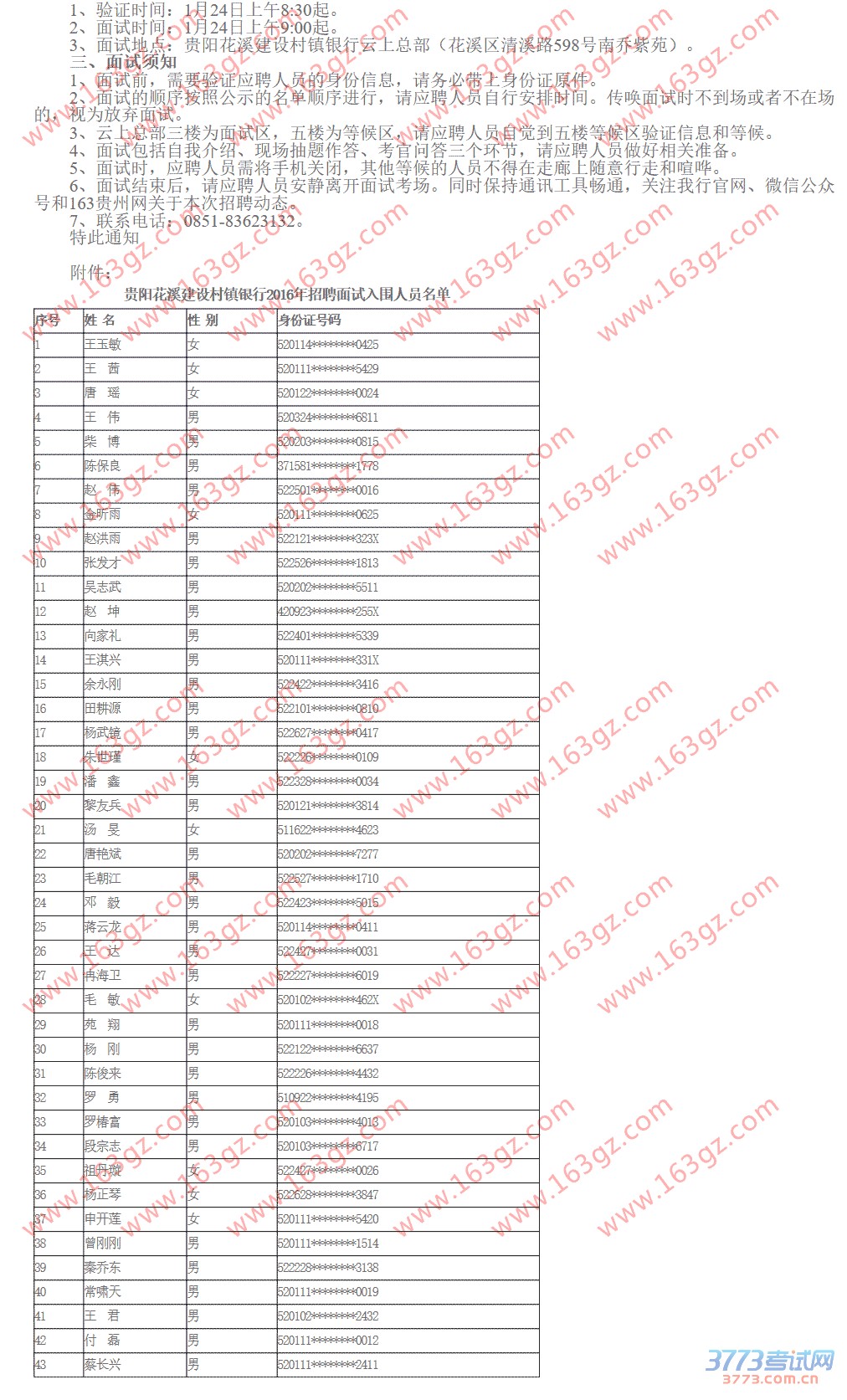 我行根据应聘人员的笔试成绩,按降序的方式排列,确定前43名为面试入围人员。名单将通过我行微信公众号、163贵州网公布,同时电话通知入围人员。