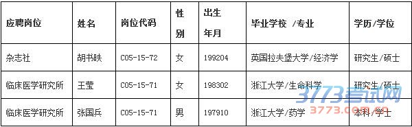根据2015年《浙江省人民医院公开招聘人员公告》,经报名、资格审查、笔试、面试、体检和考核,现确定下列人员为我院拟聘用人员并公示如下:
