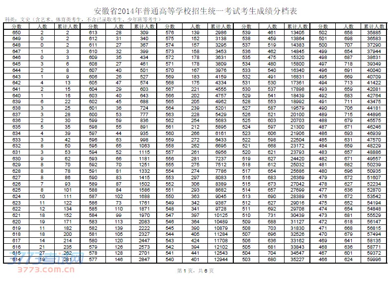 2014安徽高考600分以上人数文科777人理