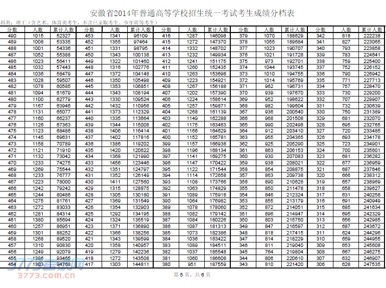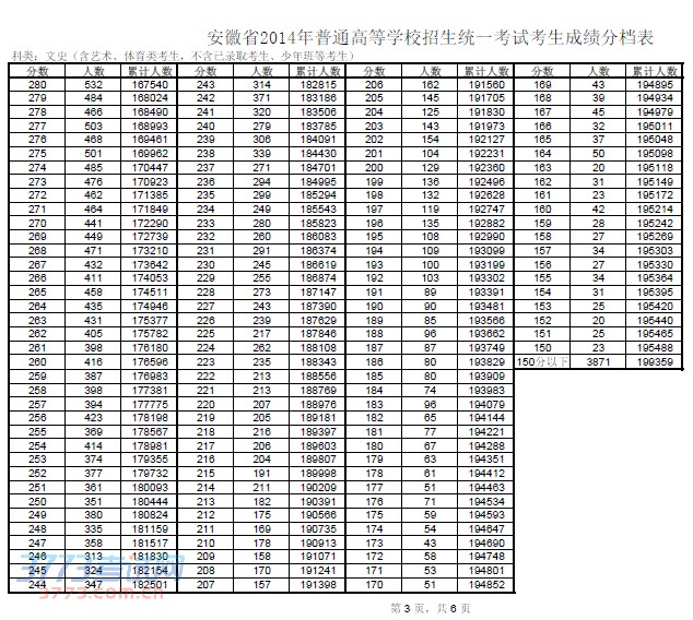 2014安徽高考考生成绩分数分档表发布
