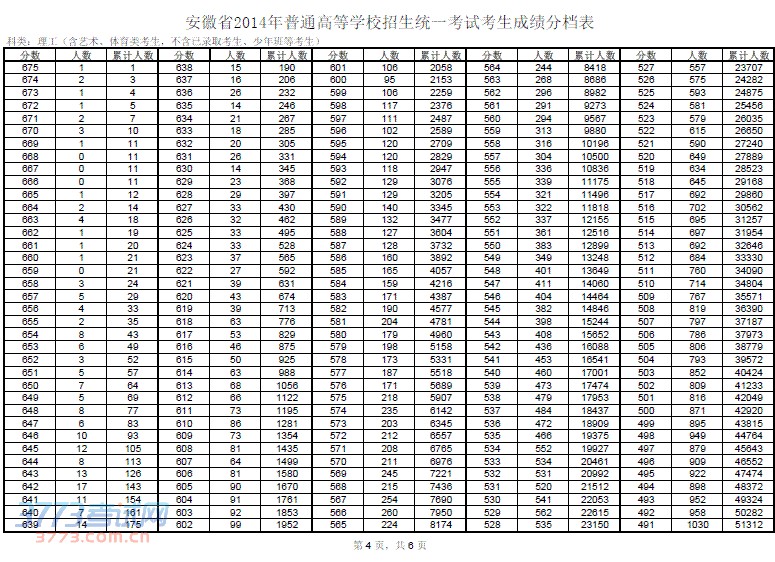 安徽省2014年普通高等学校招生统一考试考生成绩分档表
