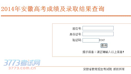 2014年安徽高考成绩及录取结果查询座位号:身份证号:验证码:8347提示信息:请正确输入以上信息!