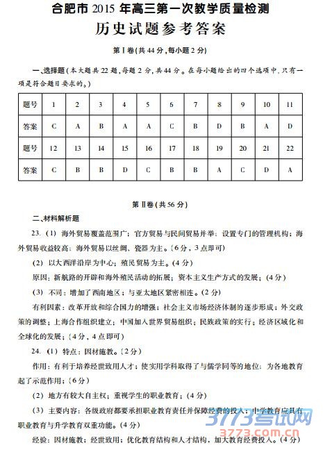 2015合肥一模历史答案及评分标准