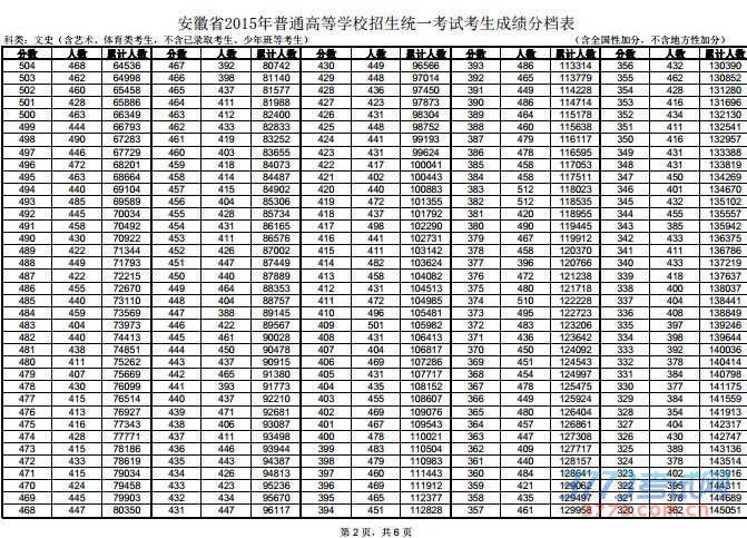 2015安徽高考分数段考生成绩分档表(文理含加分)