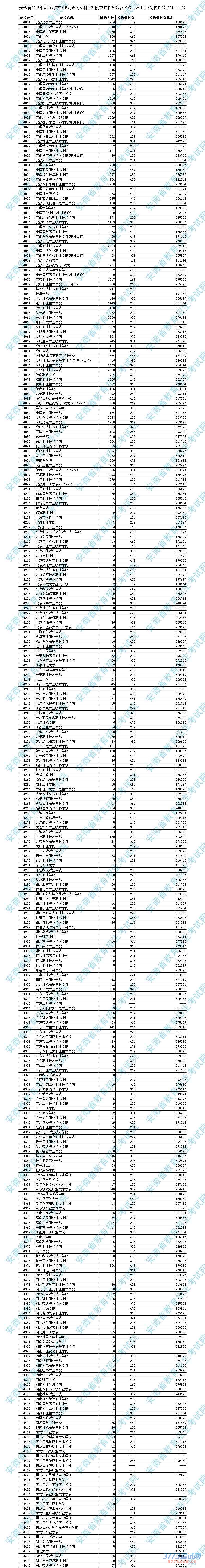 安徽省2015年普招高职(专科)投档分数及名次(理工)(院校代号4001-4440)