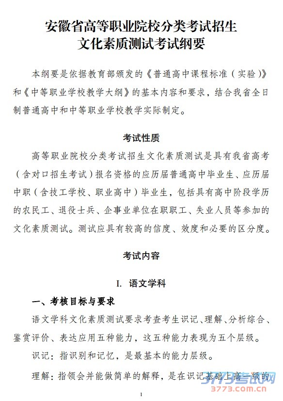 安徽省高等职业院校分类招生考试文化素质测试考试纲要